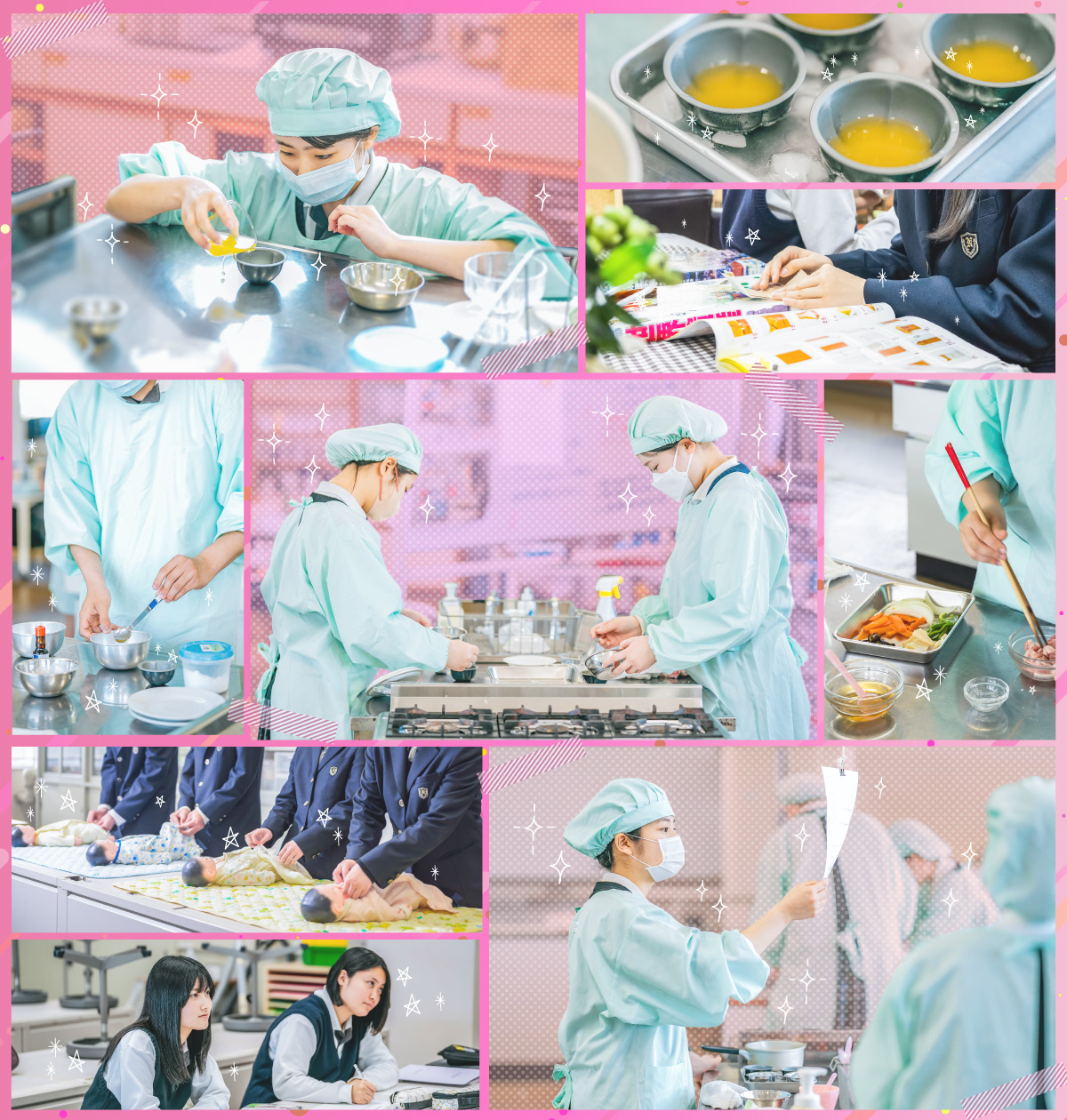 実験・実習、製作、調査研究等を通して、食物、保育に関する知識や技術を習得し、それらを活用して資格取得や課題を解決する力を身に付けます。
