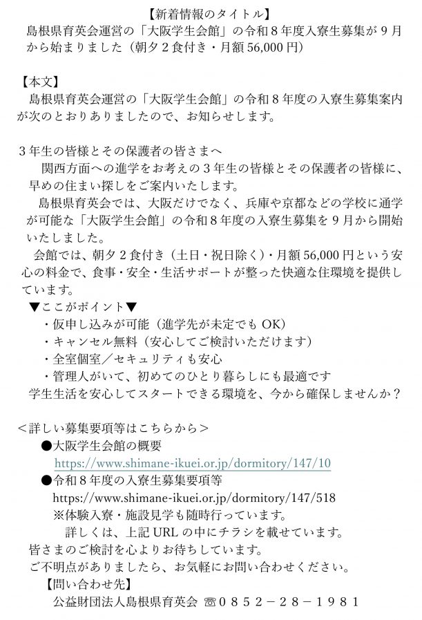 ホーム お知らせ 島根県育英会運営の「大阪学生会館」の令和8年度入寮生募集が9月から始まりました(朝夕2食付き・月額56,000円) NEWSお知らせ 2025.09.10 イベント情報 島根県育英会運営の「大阪学生会館」の令和8年度入寮生募集が9月から始まりました(朝夕2食付き・月額56,000円) PDF版はこちらです。 一覧に戻る
