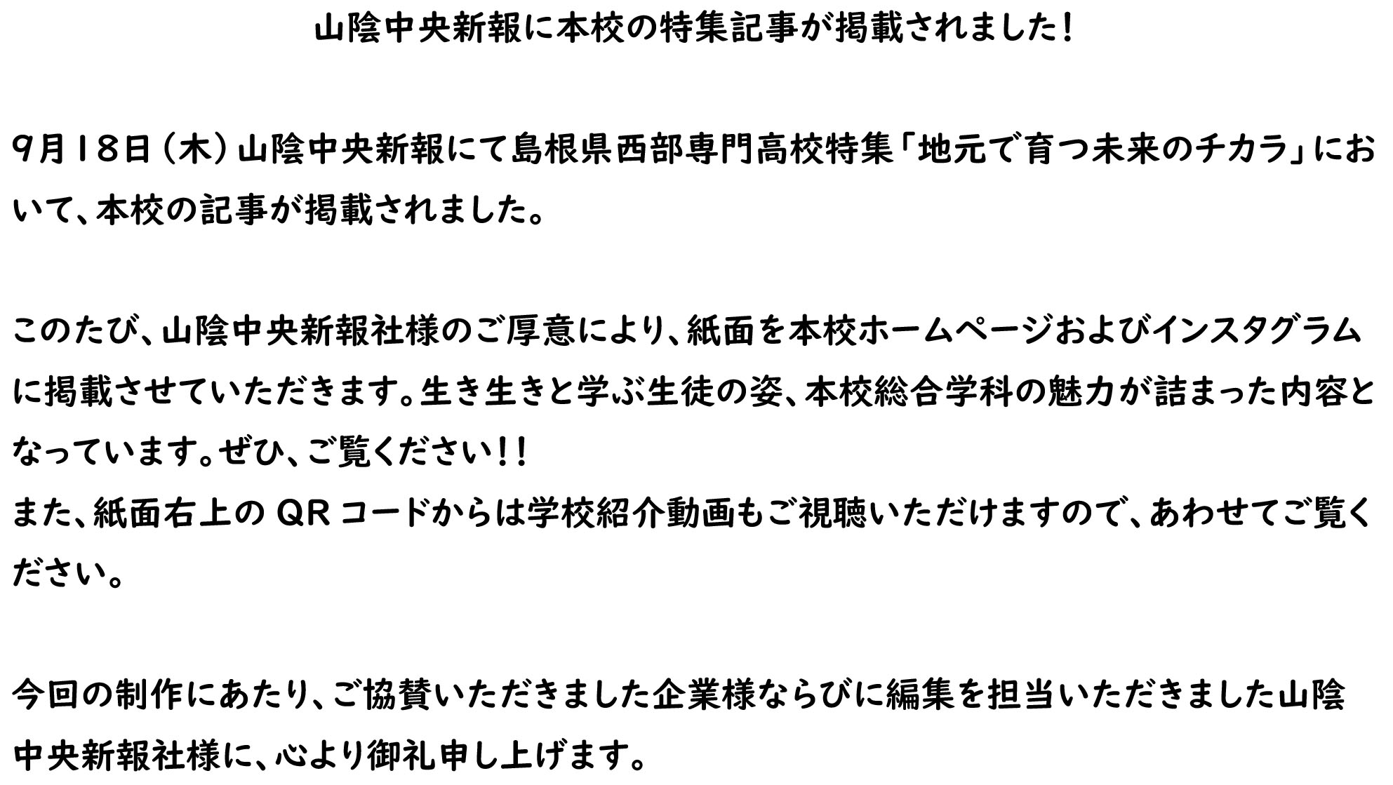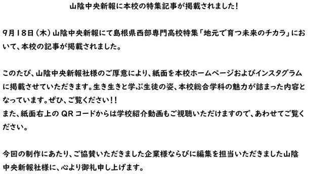ホーム お知らせ 山陰中央新報に本校の特集記事が掲載されました! NEWSお知らせ 2025.09.19 イベント情報 山陰中央新報に本校の特集記事が掲載されました! 山陰中央新報の記事はこちら、ご協賛いただいた企業様はこちらです。 一覧に戻る