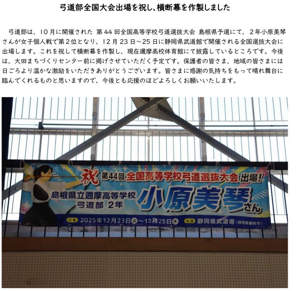 弓道部全国大会出場を祝し、横断幕を作製しました
