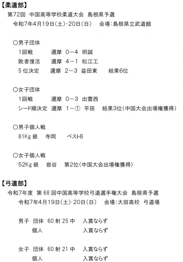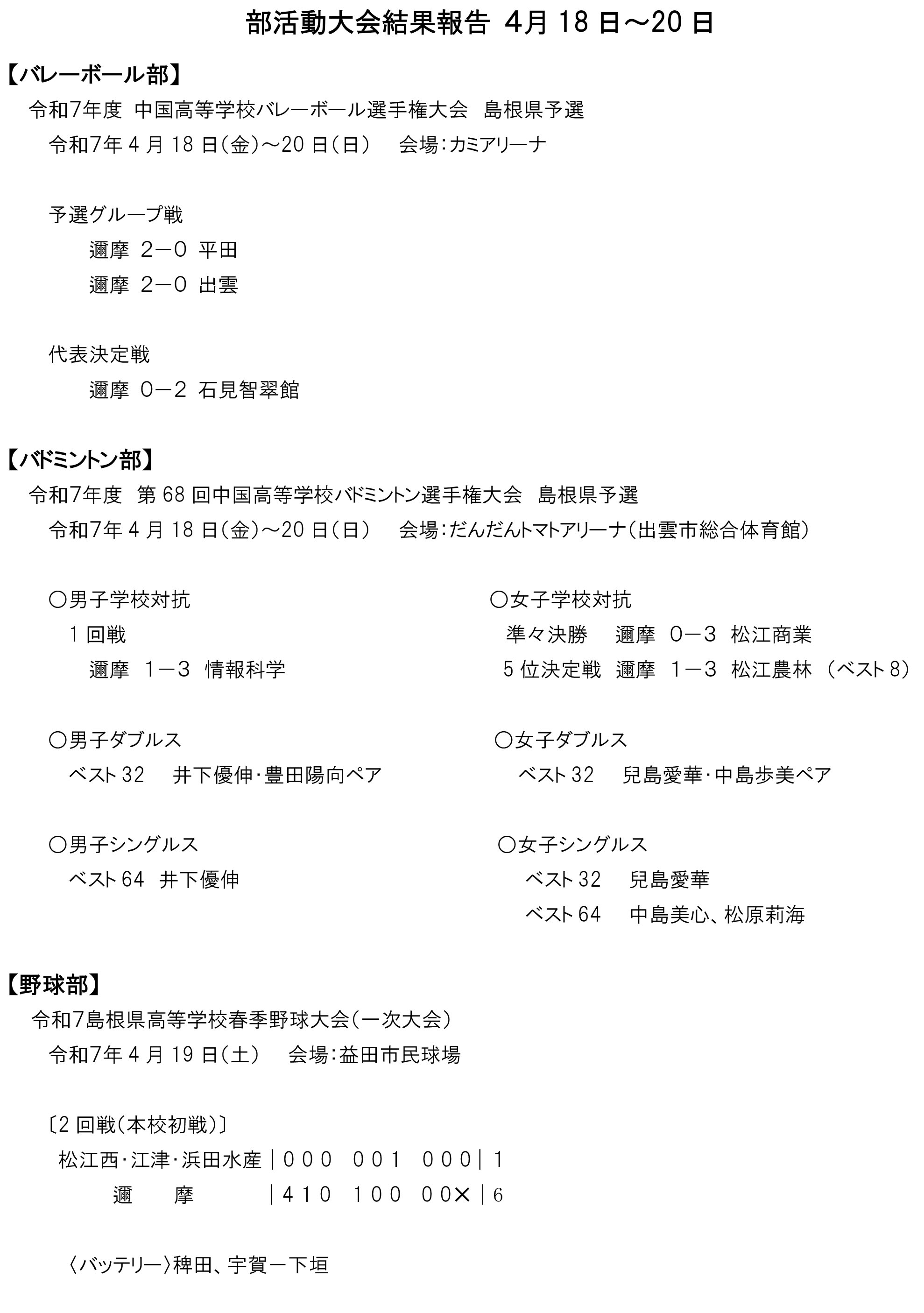部活動大会結果報告 4月18日~20日