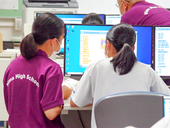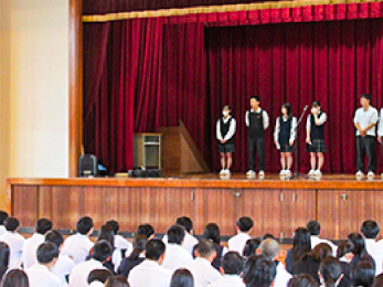 白を基調にしたポロシャツは襟元にグレーの差し色があり、締め付けがなく、他校にはない邇摩高校ならではのデザインです。