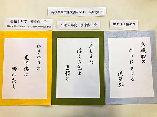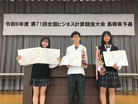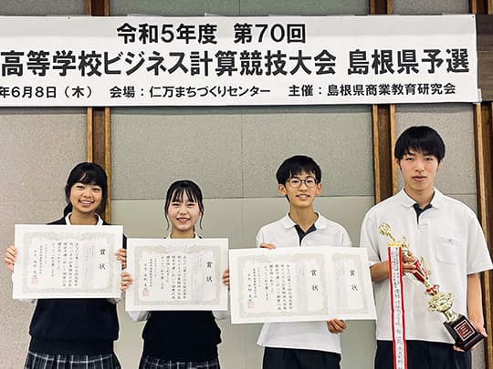 令和元年度は島根県高等学校商業教育実技競技大会(ワープロ競技)で個人優勝を果たし、中国五県商業教育実技大会に出場、また、令和2年度は珠算で1名、ワープロで1名が中国五県商業教育実技大会に個人枠で出場、令和3年度は珠算とワープロで全国大会へ出場、秋季大会珠算の部で団体優勝・中国大会4位、電卓の部では中国大会団体7位に入りました。さらに令和4年度も珠算で個人が全国大会へ出場するなど確実に結果を残しています。令和5年度、令和6年度には珠算競技で団体2連覇を果たし横浜市で開催された全国大会へ出場しました。令和7年度は珠算経験のある1年生3名を迎え3連覇を目指して練習しています。秋からは久しぶりにワープロ競技に1年生がエントリーします。