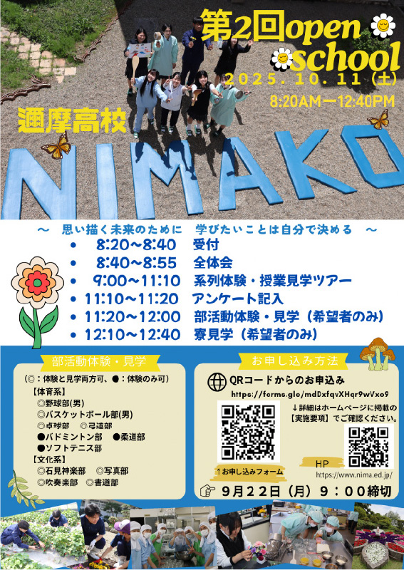 ホーム オープンスクール OPEN SCHOOLオープンスクール 令和7年 第2回邇摩高校オープンスクール実施要項 日付 令和7年10月11日(土) 時間 8時20分~12時40分 会場 島根県立邇摩高等学校 大講義室ほか 内容 ●系列体験 ●授業見学ツアー ●部活動体験・見学 ※野球部の体験には、「参加同意書」の提出が必須です。 申込 QR コードを読み取るか、WEBエントリーフォームよりお申し込みください。 WEBエントリーはこちら pdfダウンロードはこちら