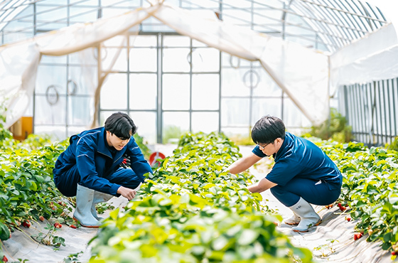 上記の制服以外にも行事等で使用する系列別のポロシャツもあります。【みらいビジネス】は紫、【農業とくらし】は緑、【ひとと福祉】は青、【食とこども】は赤です。