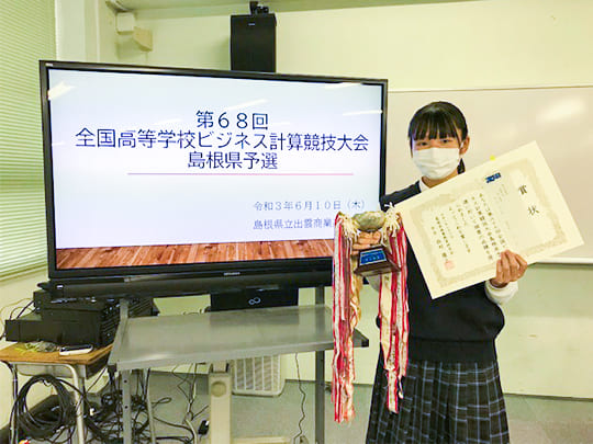 令和元年度は島根県高等学校商業教育実技競技大会(ワープロ競技)で個人優勝を果たし、中国五県商業教育実技大会に出場、また、令和2年度は珠算で1名、ワープロで1名が中国五県商業教育実技大会に個人枠で出場、令和3年度は珠算とワープロで全国大会へ出場、秋季大会珠算の部で団体優勝・中国大会4位、電卓の部では中国大会団体7位に入りました。さらに令和4年度も珠算で個人が全国大会へ出場するなど確実に結果を残しています。令和5年度、令和6年度には珠算競技で団体2連覇を果たし横浜市で開催された全国大会へ出場しました。令和7年度は珠算経験のある1年生3名を迎え3連覇を目指して練習しています。秋からは久しぶりにワープロ競技に1年生がエントリーします。